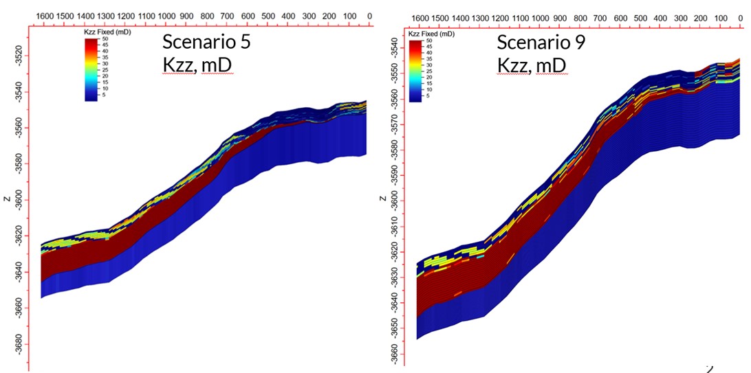 This sensitivity analysis highlighted that simple arithmetic averaging (as in PetrelProxi) leads to significant loss of connectivity control, especially in low-permeability mud-drape intervals.