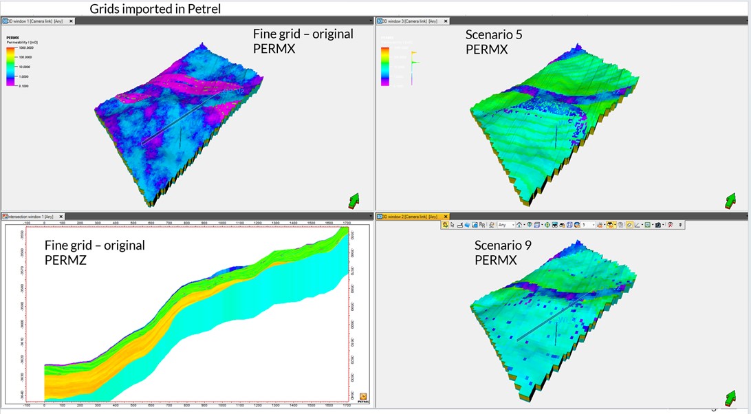 The study considered multiple permeability scenarios. For each grid, PERMX, PERMY, and PERMZ distributions were generated using different upscaling methods: