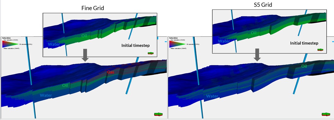 The fine-grid model revealed distinct flow barriers where oil was trapped beneath mud drapes. Gas evolved locally from solution, forming isolated caps that affected pressure response—behaviors entirely absent in the upscaled proportional models.
