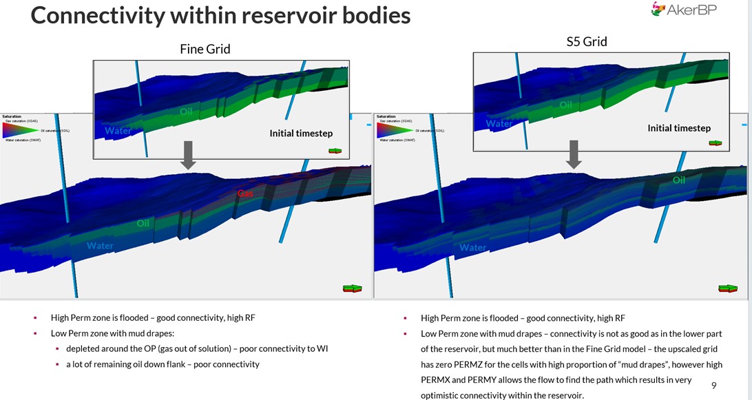 Upscaling changes both grid geometry and flow properties. To test sensitivity, Aker BP performed flow-based upscaling in Petrel, comparing permeability and saturation transfer from the fine grid to the coarser S5 and S9 grids.